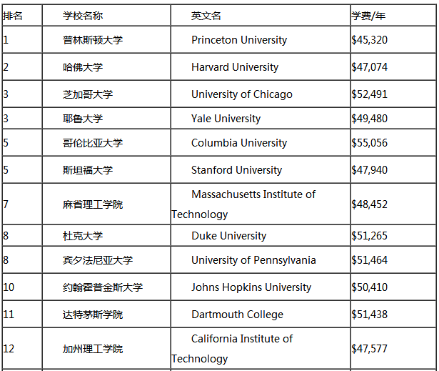 一、美国2018USNEWS大学排行榜TOP50学费一览表