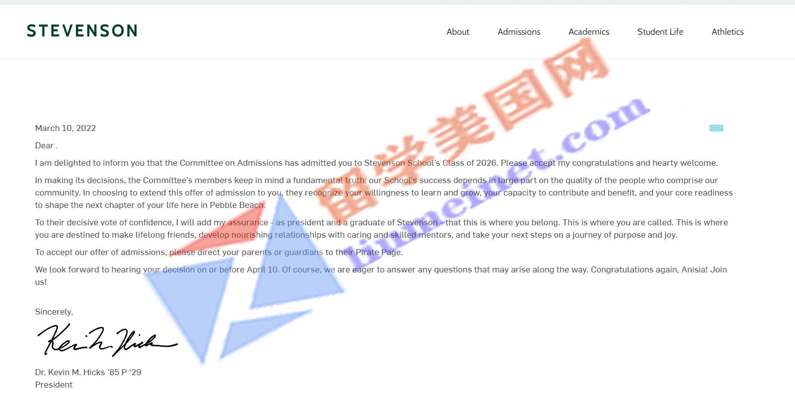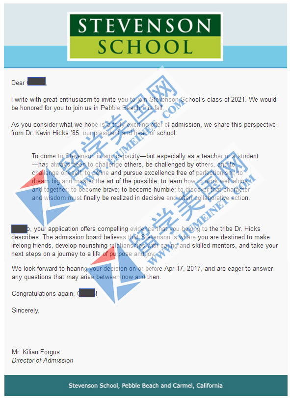 留美网再传录取捷报!恭喜留美网C同学获得寄宿TOP前50的史蒂文森中学Stevenson School录取!