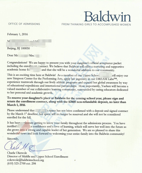 鲍德温学校The Baldwin School是一所贵族女子私立走读学校,坐落于美国东部宾州布林摩尔区,学校面积不大,学生人数也不多,但已有一百多年历史了,人文环境很好,老师待人和善,学校很人性化,硬件设施小而精。这所学校教学质量很高,毕业生去常春藤盟校的比例去年达到20%,不少学生去了宾大的沃顿商学院。