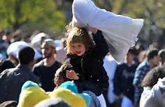 6日当天艳阳高照,所有来到华盛顿广场的人们都随身携带着各种样式形状的枕头,有的参与者为了避免在打闹中受伤,更是戴上了头盔,准备迎战。随着一声开始令下,现场立刻陷入了一场混战,只见成百上千的枕头在空中飞舞,人们互相拍打着素不相识的陌生人,以求娱乐和释放压力。其中也有不少伤者,纵使擦着鼻血,也要继续的打闹。