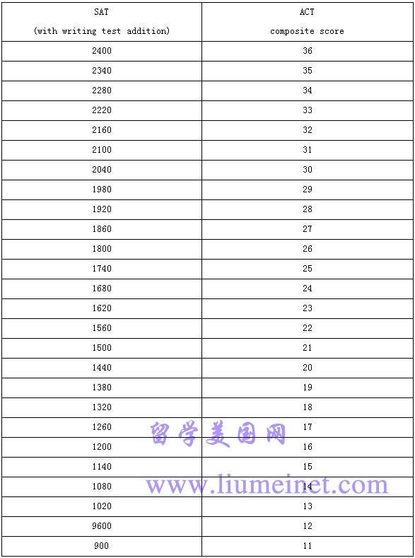 美国大学考试的SAT和ACT的分数的转换表