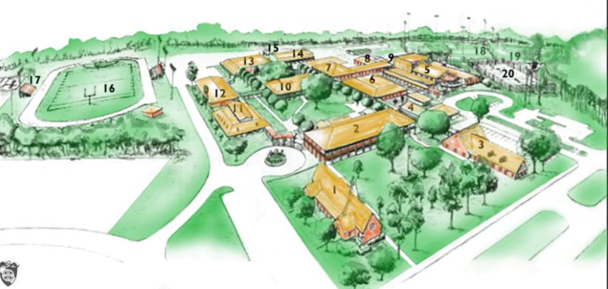 学校占地55英亩,有12栋建筑,古典砖式结构,与其说是高中,倒不如说更像大学。建筑与建筑之间,以及建筑与苍翠茂密的庭院之间步行即可到达,学生们可以充分感受到严谨的学术氛围,甚至当他们走进视觉艺术表演中心时也是如此。艺术中心于2001年成立,占地3400平方米,还有剧院,个人音乐教室和练琴房。学生如果有体育方面的爱好,户外运动场所包括橄榄球场(许多学校活动的中心),8跑道的田径场,足球场,棒球场和垒球场,2个室内运动场,多功能体育场和一个世外游泳池。