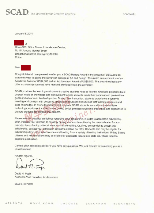 尽管李同学没有强烈要求我们为其申请奖学金,但是秉承认真负责的态度,留学美国网为该生争取了能够争取的奖学金,在刚获得的萨凡纳艺术大学的录取同时,学校也给出了双份奖学金,学术优秀奖和艺术优秀奖,总价值近一万美元。如下图录取信: