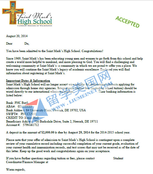 恭喜杜同学获美国东部优质高中圣马可中学录取!很荣幸,他是圣马可中学秋季最后一个录取的学生,也是是留学美国网为学生尽力争取的!