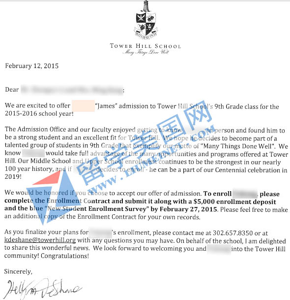 恭喜李同学获得美国顶尖走读高中前50高中--塔山学校TOWERHILL SCHOOL录取!塔山学校是美国顶级走读高中,在本州与顶尖寄宿圣安德鲁高中齐名!