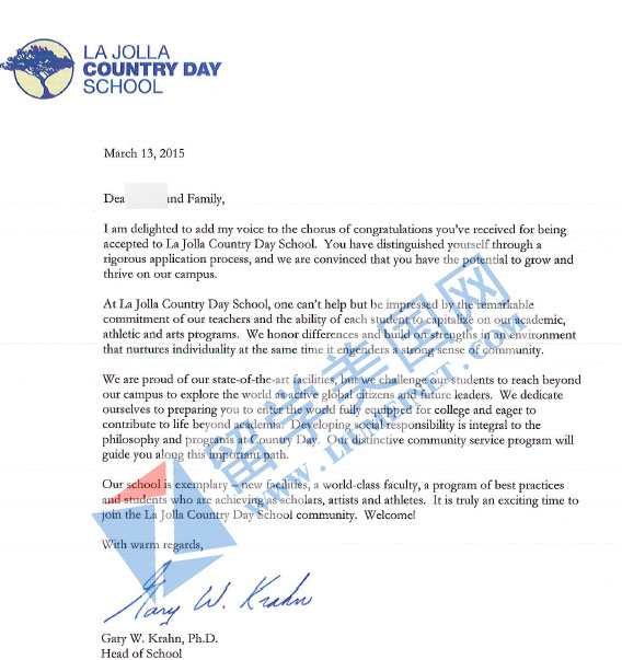 留美网有多名学生获得该校录取,下面是其中一名同学的录取信: