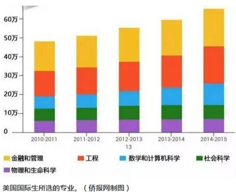 美国《门户开放报告》中有一项专门针对国际学生所学专业的统计。从2012—2013学年到2014—2015学年三年的数据来看,中国学生选择专业的倾向十分明确且稳定:最受欢迎的是商科,每年都有四分之一以上的人学习商科,在2014-2015学年,这部分学生的总人数超过8万。