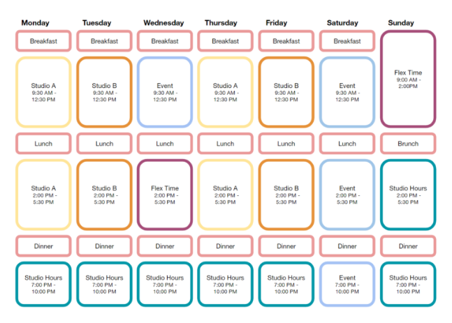 学生参加以下两门2学分工作室课程。学生日常安排课表如下: