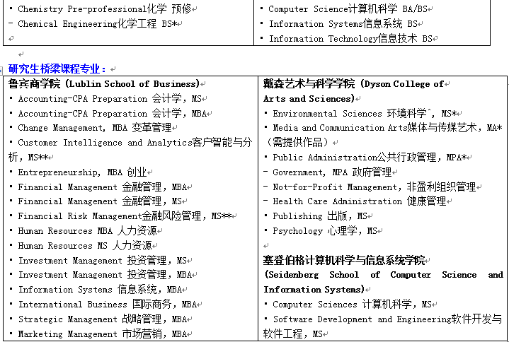 ² 佩斯大学与哥伦比亚大学,纽约州立大学,纽约医学院以及纽约大学开设本硕连读课程,在学生完成Junior Year前向各学院申请。总计五年内可以获得Master Degree;