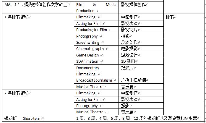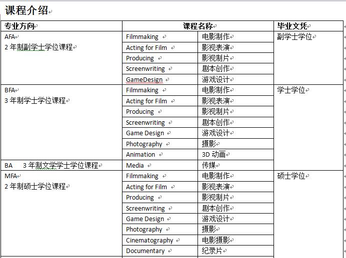 艺术副学士学位(AFA)、艺术本科学士学位(BFA),文学学士学位(BA),艺术研究生学位(MFA),影视媒体创作文学学士学位(MA)