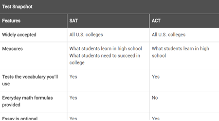了解SAT和ACT在考试当天的期望是确定哪一个最适合您的好方法。例如,如果您希望有足够的时间回答问题,那么SAT可能更适合您的速度。如果您的兴趣倾向于科学,那么ACT可能会通过他们的科学特定部分激起您的兴趣。国家税务总局不会忽视科学内容; 相反,它贯穿整个测试。