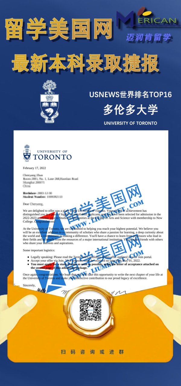 大家好!2021年过去了,留学美国网感谢各位朋友的陪伴与信任。2022年已经向我们走来,在留学美国网全体同仁的努力下,在与众多家长和学生的共同努力下,留学美国网的学生取得了许多优质学校录取!让我们对拿到录取的同学和家庭致以最诚挚的祝福! 祝贺留学美国网C同学获得伦敦艺术大学录取! 祝贺留美网C同学成功收获University of the Arts London录取 伦敦艺术大学(University of the Arts London),简称“伦艺”(UAL) 前身为伦敦学院 (The London Institute) 1986年成立于英国伦敦,采用书院联邦制。UAL将世界上最著名的致力于艺术、设计,表演等相关领域的多所建于十九世纪的古老艺术学院联合。2019QS世界大学排名艺术与设计排行榜世界第2名,本科世界排名第1名。2019-2021年连续三年蝉联QS世界大学排名艺术与设计排行榜世界第2名。再次恭喜C同学得偿所愿收获University of the Arts London录取! 祝贺留学美国网Z同学获得多伦多大学录取! 祝贺留美网Z同学成功收获University of Toronto录取 多伦多大学 (University of Toronto,简称UofT,UT),始建于1827年,坐落在加拿大第一大城市多伦多,起源于公元1827年的国王学院King's College。是世界著名公立研究型大学,享誉全球的顶尖高等学府,主校区(简称UTSG)位于多伦多市中心,校园环绕安大略省政府与皇后公园。 让我们再次恭喜留美网Z同学,希望他可以在多伦多大学收获属于自己的成长~ 祝贺留学美国网S同学获得萨凡纳艺术学院录取! 祝贺留美网S同学成功收获Savannah College of Art and Design(SCAD)录取 在2020年最新QS世界大学排名艺术与设计类专业中该校位列全球第36位。优势专业包括全球排名第一的动态媒体设计,全美排名第一的室内设计,以及同样持续为迪士尼动画和皮克斯动画,梦工厂等全球顶级动画公司注入毕业人才的动画专业,时装设计,平面设计,工业设计等享誉美国。让我们再次恭喜留美网S同学! 祝贺留学美国网C同学获得南安普顿大学录取! 祝贺留美网C同学成功收获University of Southampton录取 关于留美网2022年优质美本录取就为大家分享到这里了,想要申请大学留学的朋友可以持续关注留学美国网!