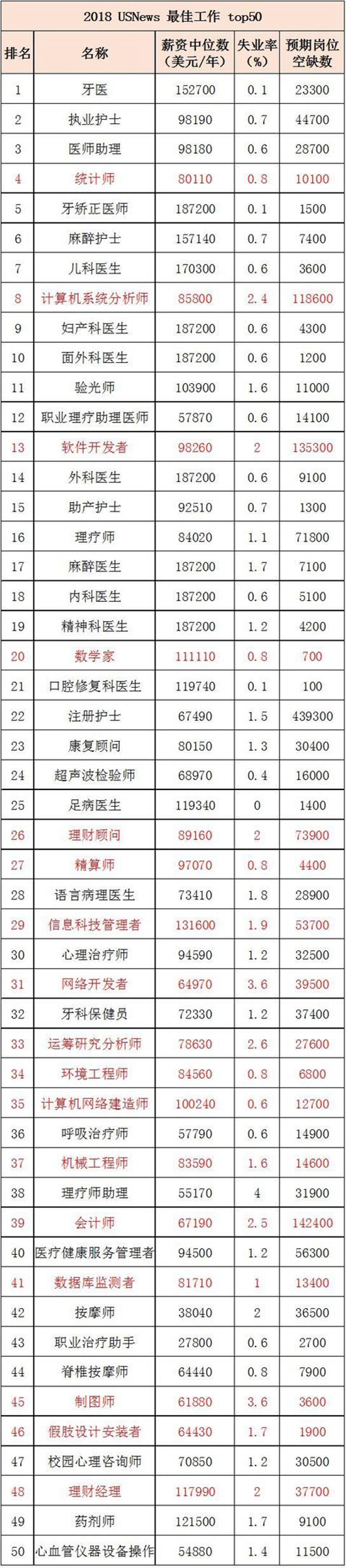 美国赚钱的50个职业都在这份榜单上了。我们可以看见,医学类的占据了一半左右,其他就是商科和工科类专业了。这份榜单超乎我们的想象:没想到医学在美国这样吃香。