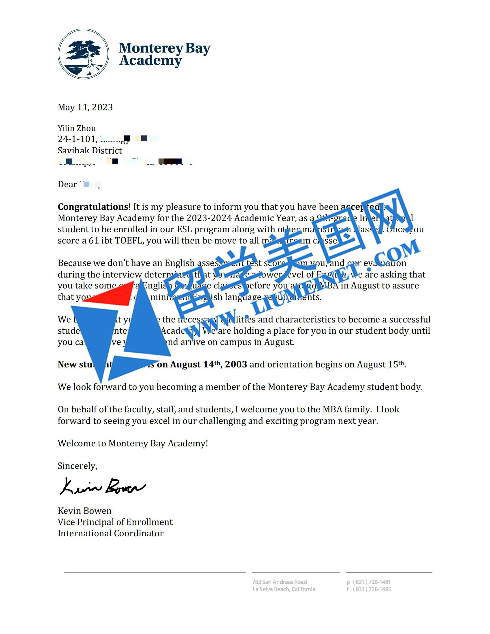 恭喜留美网Z同学斩获蒙特雷湾学院 Monterey Bay Academy 录取offer