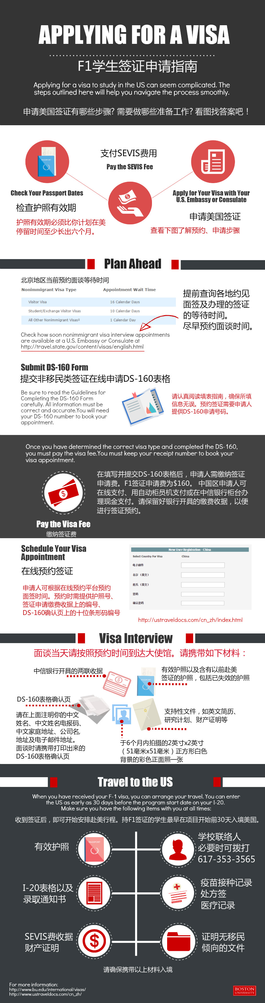 一很多新生都对美国签证的申请流程有疑惑。申请F1签证,需要准备哪些材料?相关流程是什么?如果出现问题或在入境时被Check,需要联系哪个部门?针对这些疑问,我们为即将入学的New Terriers 制作了美国签证申请指南信息图。复杂流程,就让这张图表为你。