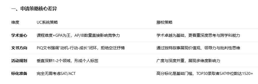做美本申请这么多年,我们一直和美本的招生官保持紧密的联系,而且从和招生官的交流和对话以及成功案例分析来看,藤校和UC系在录取学生方面有着很大的差别。那么到底有什么差别呢?在我们申请过程中要注意哪些方面呢?下面就让我们一起来看看吧~ 我们都知道申请材料主要包括两个部分,一部分是学术和非学术。 加州大学录取逻辑:学术为王,文书定乾坤 学术优先:UC系统将课程难度、GPA和文书列为"非常重要"的因素,课外活动仅为"考虑"级别。 UC系统内部差异: UCLA:特殊才能/能力属“重要”级别,学生背景更多元; UCB:特殊才能/能力仅属“考虑”级别,学术氛围更浓厚。 藤校及顶尖私校:全面评估,偏好“六边形战士” 1、共同重要项 课程难度、GPA、文书、推荐信、课外活动、个人品质。 部分学校重视班级排名、标化成绩。 2、个性化案例 哈佛:无明确“非常重要”项,录取最玄学,依赖招生官主观判断。 莱斯大学:标化成绩“非常重要”,且考虑“对学校的兴趣”(ED录取占比显著高于RD)。 MIT:恢复标化要求,标化成绩列为“重要”项。 一、申请策略核心差异 二、各校偏好与针对性策略 UC系统内部差异: UCB:偏好有科研经历、关注社会议题的学生,文书需体现思辨深度。 UCLA:青睐性格鲜明、有多元经历的“全能型”申请人,人文类活动是加分项。 UCSD:重视数学与理工科基础,竞赛获奖经历更具优势。 UCI:适合扎实稳健型学生,社区服务与本地实践经历受青睐。 藤校个性化偏好 哈佛:无固定模板,重视整体印象与“不可替代性”,需通过文书与推荐信塑造独特人设。 MIT:痴迷于解题能力与创新思维,高含金量竞赛(如IMO、ISEF)几乎是必备项。 布朗:开放课程体系下,需展现自主学习能力与跨学科探索热情。 三、行动指南:两类申请者的攻坚路径 UC型选手攻坚点: 1、10年级起布局AP/荣誉课程体系,保持GPA上升曲线。 2、聚焦1-2个核心活动,积累可量化的成果(如论文、项目、奖项)。 3、PIQ文书提前3个月启动,经历需与UC价值观(社会贡献、多元包容)紧密挂钩。 藤校型选手破局点: 1、标化早出分,SAT力争1500+(TOP20需1550+)。 2、构建“学术+领导力+个性”三维矩阵,避免同质化包装。 3、推荐信需呈现课堂外的立体形象,提前与老师建立深度连接。 结语:选对赛道比盲目努力更重要。UC要的是“学术尖兵”,藤校找的是“未来领袖”。认清自身特质,精准匹配策略,才是2026申请季的制胜关键。 留美网24小时热线:15011066813 专家热线:13910531929 微信公众号:liumeinet(迈润肯高中留学) 顾问微信:liumeinet2014