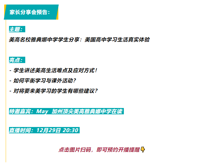 12月29日(周日)20:30,我们邀请到通过留美网申请入加州顶尖美高雅典娜中学的May,在本次直播中将为大家解答如下问题: