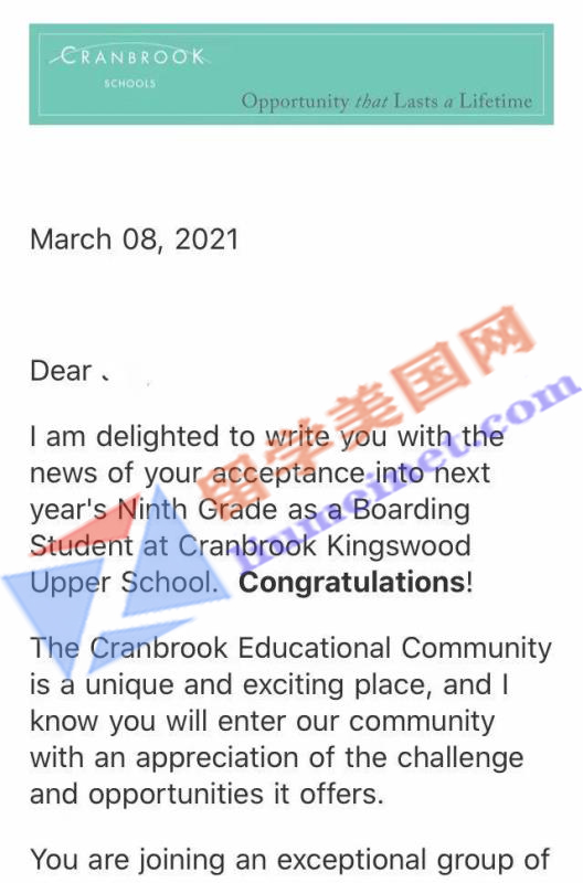 留美网再传录取捷报~恭喜留美网Jay同学喜获美国TOP50顶尖寄宿克瑞布鲁克中学Cranbrook Schools的录取offer,拿到这么好的录取offer离不开石老师、留美网老师和学生以及家长所有人的共同努力!让我们再次恭喜留美网Jay同学~希望他可以在美高旅途中收获助于自己的风景~