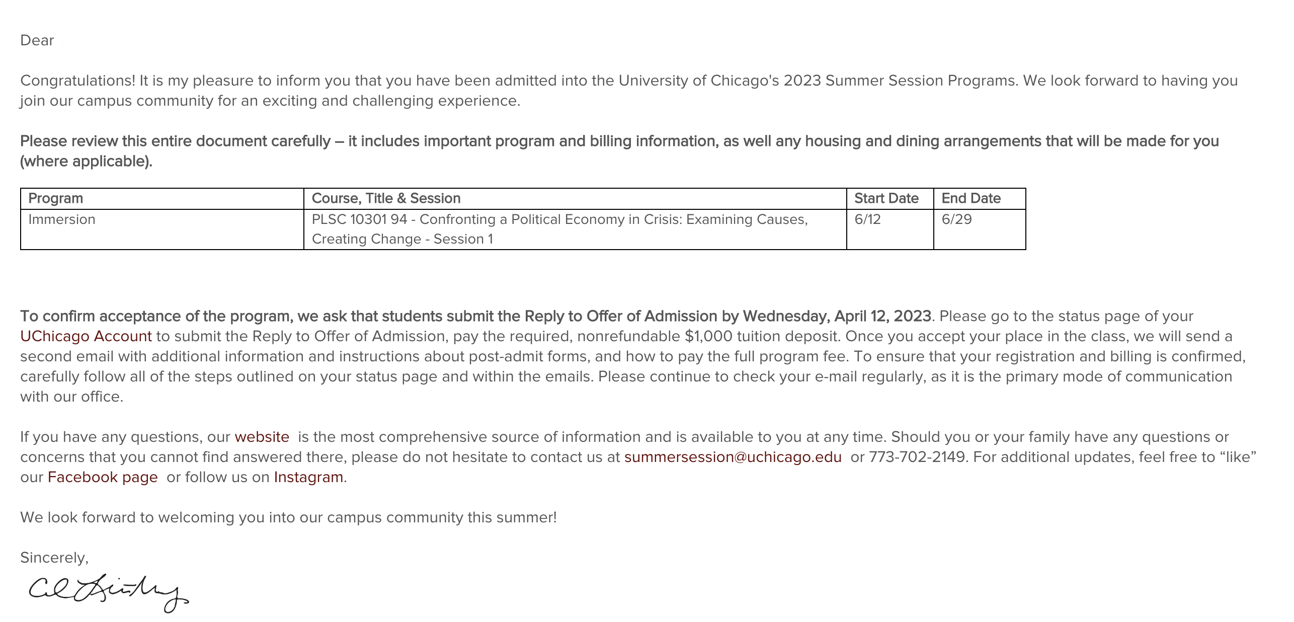 录取喜报,恭喜留美网Y同学斩获芝加哥大学University of Chicago夏校录取offer~!