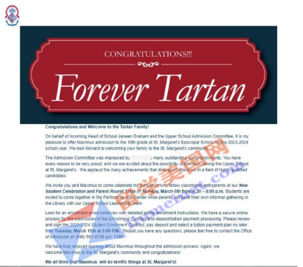 最终在面试环节,表现得非常出彩,获得了招生官的喜欢和青睐,成功斩获斩获圣玛格丽特主教学校St.Margaret's Episcopal School录取offer!
