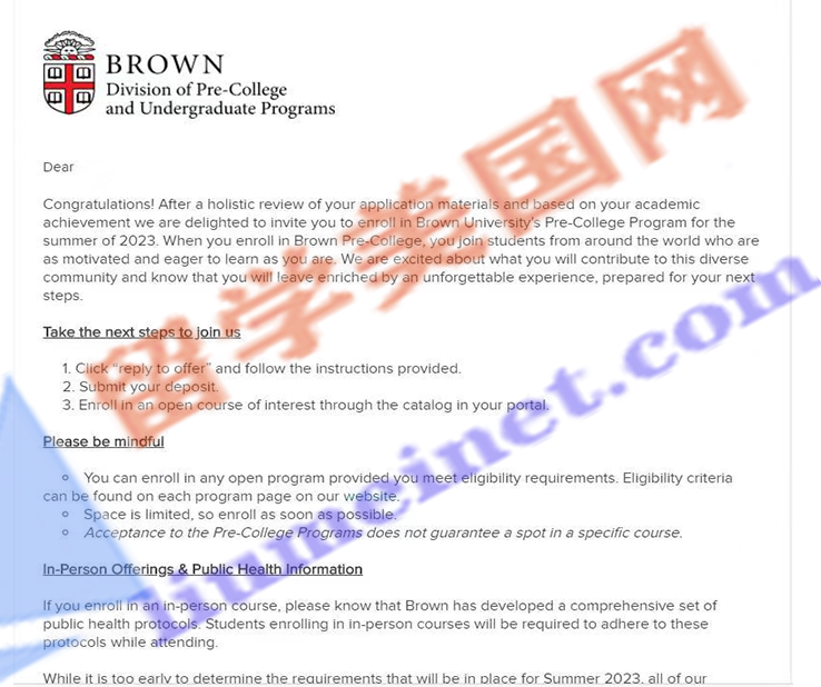 留美网喜报频传,恭喜留美网D同学斩获布朗大学夏校录取offer~!