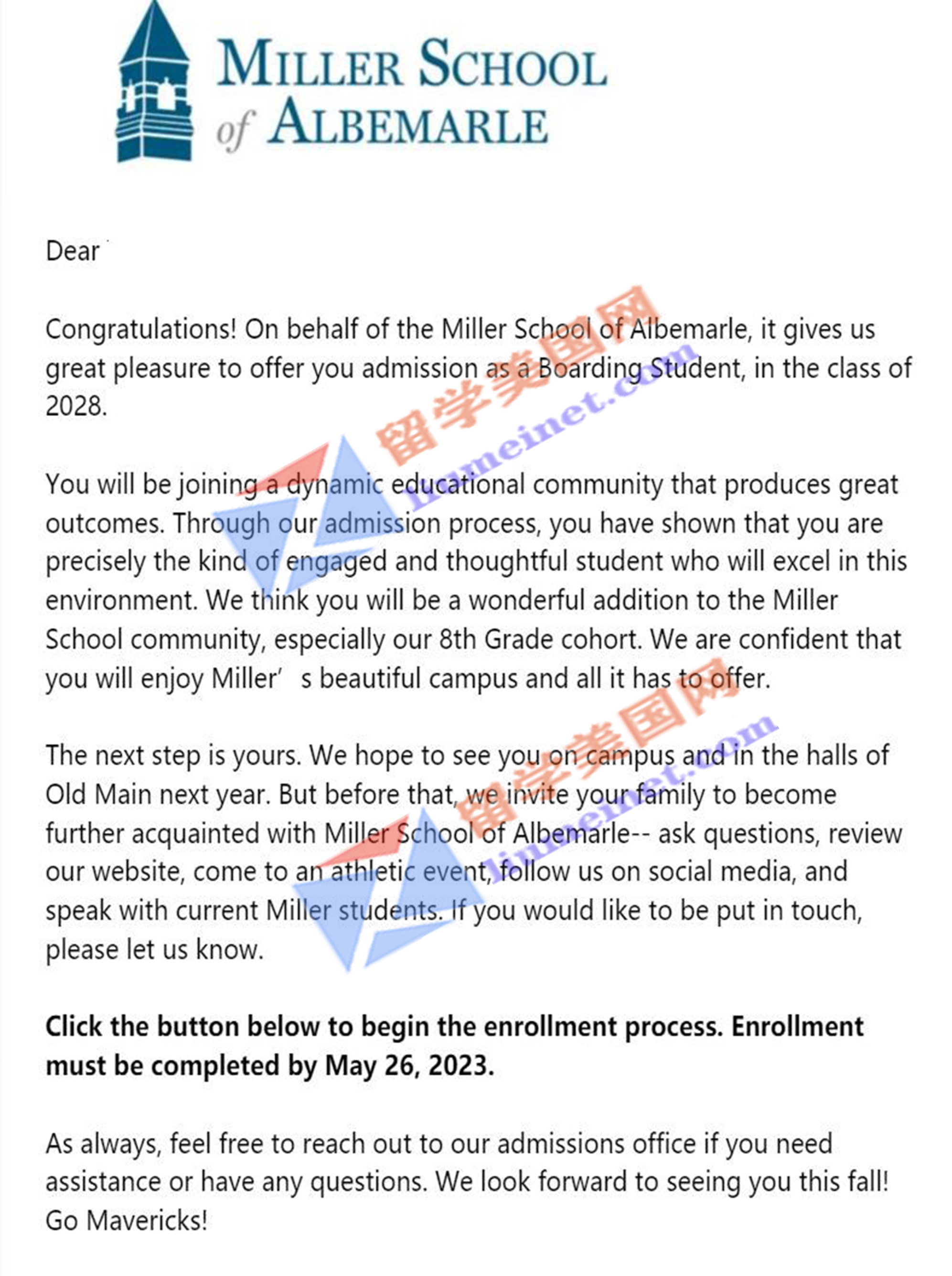 录取喜报!恭喜留美网L同学斩获米勒中学Miller School of Albemarle的录取offer~