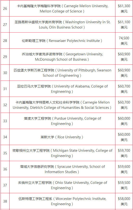 实际上,目前的很多学校,比如卡内基梅隆,对大学内各学院毕业生的薪资水平进行了细化,包括计算机科学学院、工程学院(起薪68,300美元)和商学院(起薪65,000美元)。毫不奇怪的是,收入最高的毕业生中大部分都拥有这些学科的学位。但其他学校,比如普林斯顿大学(排名第18位,起薪63,700美元),以及莱斯大学(排名第36位,起薪60,000美元)报告的则是毕业生的整体薪资水平,其中包括文科、美术和社会科学专业。对于大众认为美术专业会在求职市场上遇冷,但卡内基梅隆大学美术学院的毕业生却表现亮眼,平均起薪62,100美元,在榜单上排名第24位。卡内基梅隆大学的人文学院——特里希人文和社会科学学(Dietrich College of Humanities & Social Sciences)——也很吃香,它的毕业生平均起薪60,700美元,排名第32位。