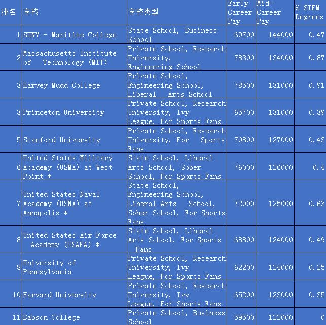 Harvey Mudd College(第3) 、USNA(第7) 、Washington and Lee University(第30)、Colgate University(第24)、Carleton College(第69) 都盛产高薪资的毕业生。有潜力的学生需要认识到读文理学院可能意味着在你的梦想职业中站稳脚跟需要多花一点时间,但是他们全面的综合教育、通识技能以及清楚的沟通能力能为你的成功职业生涯做好充分准备。