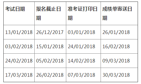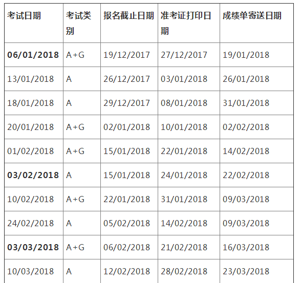 2018年1月至6月用于英国签证及移民的雅思考试报名截止日期、准考证打印日期和成绩单寄送日期