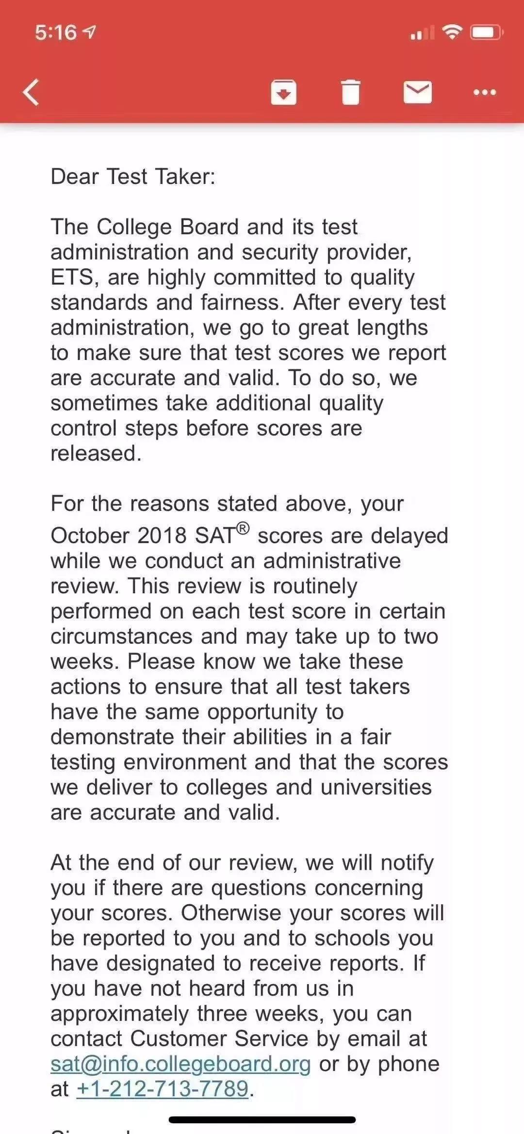 邮件大意为:为了维护考试的公平,保证每一位学生的成绩真实可靠,有时CB会在公布成绩前启用额外的审查程序,这导致了10月6日考试的出分将被延迟。CB将对考生每一门考试的成绩进行重审,这大概将花费两周的时间(如果真的是这样的话,将直接影响到学生申请ED)。