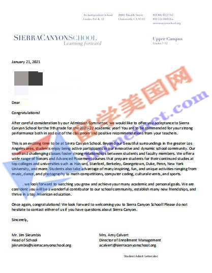 留美网再传录取捷报~恭喜留美网Hillary同学喜获美国顶尖走读高中塞拉峡谷高中Sierra Canyon School录取offer~拿到这么好的录取offer离不开石老师、留美网老师和学生以及家长所有的共同努力!让我们再次恭喜留美网学生~