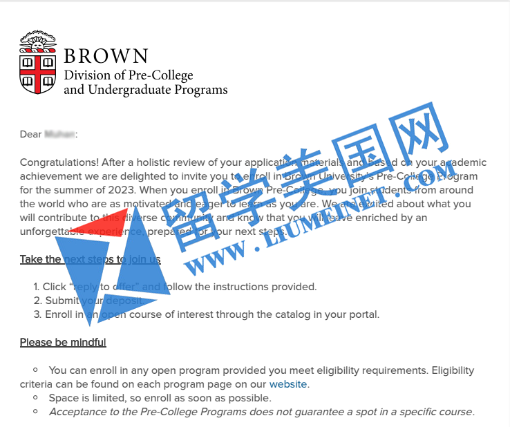 留美网喜报频传,恭喜留美网J同学斩获布朗大学夏校录取offer~!