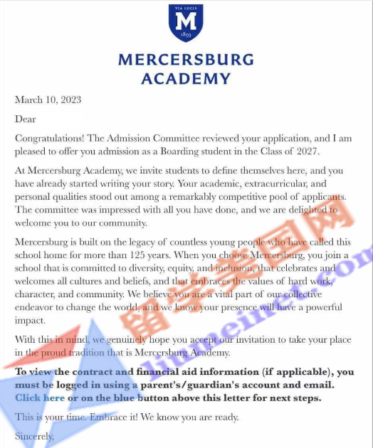 最终在学生和家长的积极配合下,我们帮助W同学成功申请到了这所顶尖美高的面试机会,并最终斩获摩尔西斯堡学院Mercersburg Academy的录取offer!