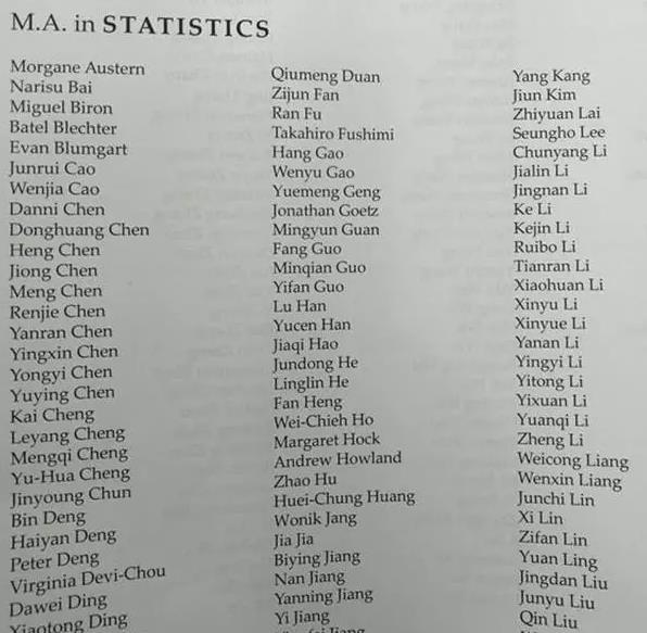 在这份名单中,确实有约80%为汉语拼音,似是中文名。“假装在纽约”称,“统计结果如下:总人数231人,其中名字一看就是中国学生的190人,占82%;港台学生6人(很好辨认,他们姓名的拼写方式和大陆不一样);华裔学生(英文名字加中国姓氏)3人;日本学生3人;韩国学生4人。如果把港台日韩和华裔学生都算在一起,也就是所谓的亚裔,则占到总人数的将近90%。”