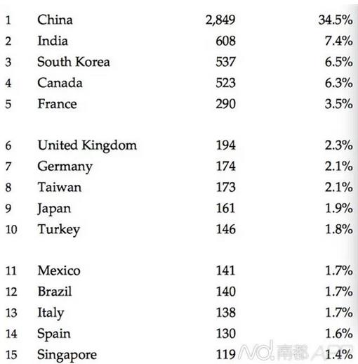 哥伦比亚大学2013年国际学生国籍分布情况。图片来源:哥伦比亚大学官网