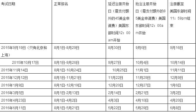 考试报名从2015年8月1日正式开始。请尽早报名以避免你想选择的考点名额已满和超过截止日期所需支付的额外费用。