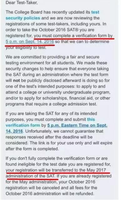 1.如果你报名了10月1日的新SAT考试,且收到该邮件,你需要在9月14日东部时间下午5点之前下载并填写、提交表格,完成身份验证。注意:请务必在截止日期之前提交表格,邮件中给出的链接在你填写后将失效。