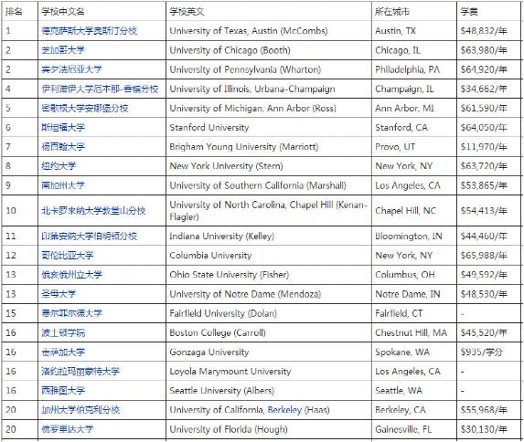 2017年美国USNews会计专业最新TOP20排名