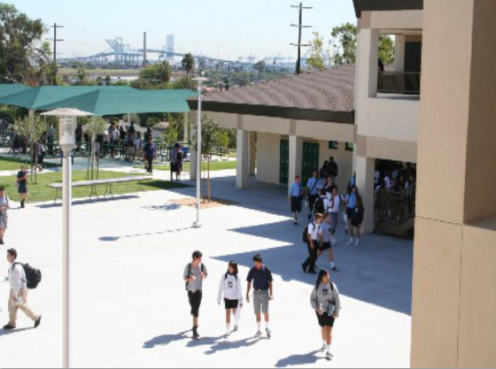 学校位于加州南湾的海滨城市San Pedro 市是大LA 地区的重要海港城市。毗邻长滩和著名的富人区罗灵谷,与LA 市中心也只有不到20 英里。该市是典型的地中海气候,冬暖夏凉,一年四季都十分舒适,且以其美味的海鲜和众多的艺术展览馆著称。San Pedro 犯罪率很低,社区富裕治安很好。校址所在街景区的住家多为配有独立游泳池的高档别墅,住户以白人和拉丁裔为主,平均收入很高,是比较典型的加州南湾富人区。